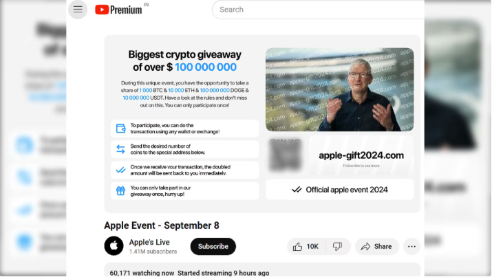 A fraudulent YouTube livestream posed as Apple’s Tim Cook September 8, 2024, event, promoting a “biggest crypto giveaway” that claimed to double participants’ investments up to $100,000. This livestream instructed victims to send Bitcoin or USDT to a designated wallet for further investment use. The video used deepfake techniques to replicate the visual and audio style of an official Apple broadcast, including logo overlays, presenter mimicry, and event-style graphics, creating a veneer of legitimacy designed to manipulate viewer perception. This synthetic announcement is a microcosm of increased amplification that converts trust into irreversible crypto transfers. Cryptocurrency-related frauds now inflict measurable economic damage: the FBI reported $5.6 billion lost in 2023 alone, a 45 percent increase from 2022, generating direct financial losses for individuals, eroding consumer confidence in digital platforms, reducing engagement with legitimate financial innovations, straining household budgets, and inflating regulatory and victim-support costs.