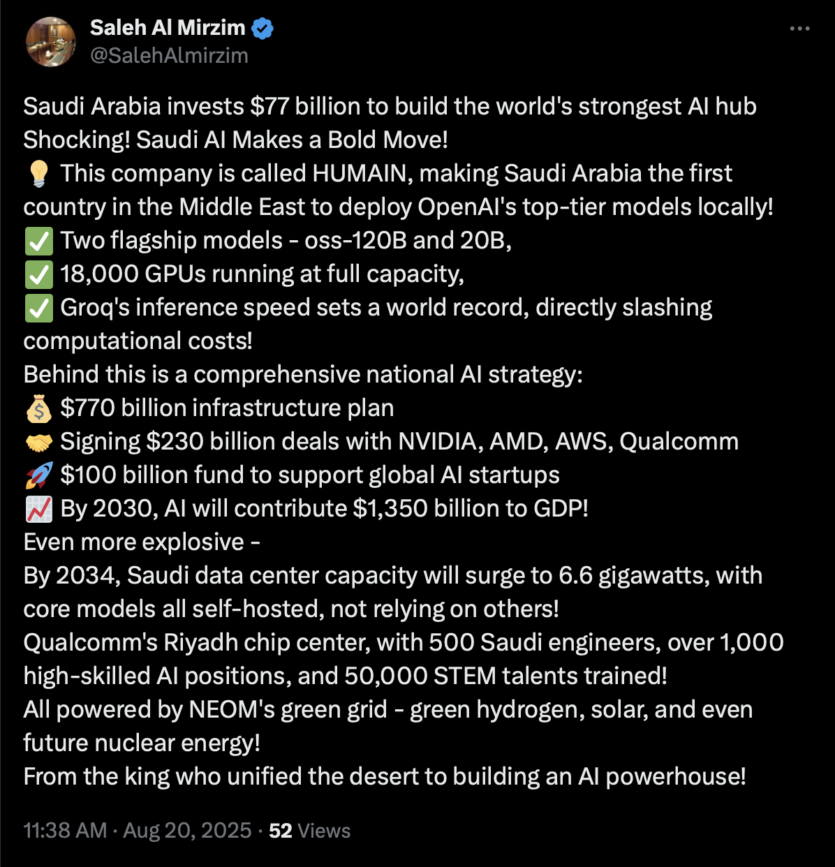 X profile Saleh Al Mirzim post on Saudi Arabia-US Agreements on AI & Infrastructure