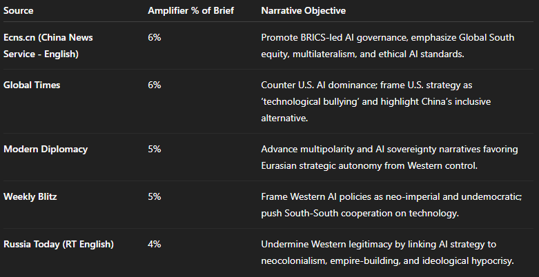 Amplified narratives emphasize why multilateral AI coordination is necessary, trying to delegitimize US AI leadership, and framing US policy as coercive or imperial. Messaging from these sources underscores themes such as digital sovereignty, strategic decoupling from US technology supply chains, and the promotion of open-source AI alternatives positioned as inclusive and non-aligned. Multiple items highlight disparities in access to AI infrastructure, casting China’s model as cooperative versus the US model as extractive. These narratives largely originate from GCA or GCA Social Media sources that seek to slant narratives in their favor to influence the global marketplace. Narrative volume peaks coincide with major geopolitical declarations or executive orders related to AI, indicating synchronization between source output and policy signals.
