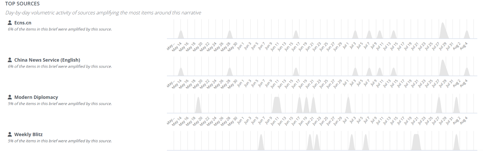 The amplification timeline for the global AI competition narrative demonstrates sustained engagement across 91 sources which began growing from May–August 2025. These sources began as sparse articles and increased amplification across Facebook, Weibo, and X, reflecting a strategically coordinated media effort. Ecns.cn one of the most pivotal sources and amplifiers of Chinese narratives leads with a consistent share of amplification, exhibiting steady peaks in mid-June and late July that signal a persistent narrative push aimed at reinforcing China’s positioning. China News Service mirrors this pattern with equivalent volume, but its impact is amplified by its international syndication reach and English-language distribution, which extend the narrative beyond domestic Chinese audiences. Peaks in early June and mid-July suggest deliberate synchronization designed to shape external perceptions of China’s cooperative AI posture. Modern Diplomacy and Weekly Blitz each account for 5% of amplification, with Modern Diplomacy active in late May and early August and Weekly Blitz peaking sharply in mid-July, indicating varied editorial timing aligned with evolving geopolitical and technological developments. Collectively, these amplification dynamics highlight an intensified and multi-faceted contest over AI and semiconductor discourse, shaped by both regional interests and broader geopolitical contestation.