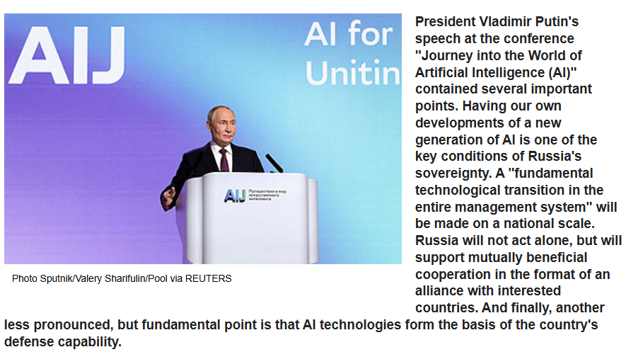 Article from Vz.ru translated into English on Putin’s speech about AI transforming tech & defense sectors in Russia
