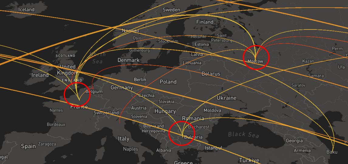 Key origins of GCA narratives in Europe are Paris, Sofia, and Moscow. There are no clear destinations that emerge in Europe, though Moscow is the primary origin for narratives contained within Europe. The narratives coming from Paris primarily focus on international cooperation and AI governance. At the 2025 World Artificial Intelligence Conference (WAIC) and related forums, the French president’s AI envoy emphasized the urgent need for global action toward openness, accessibility, inclusiveness, and establishing a strong global governance framework for AI. Additionally, narratives stemming from Paris mention collaboration between Chinese AI firms and French multinational Schneider Electric in showcasing industrial AI applications at the WAIC. GCA narratives discussing the collaboration emphasize the inclusive innovation and international partnership between France and China.