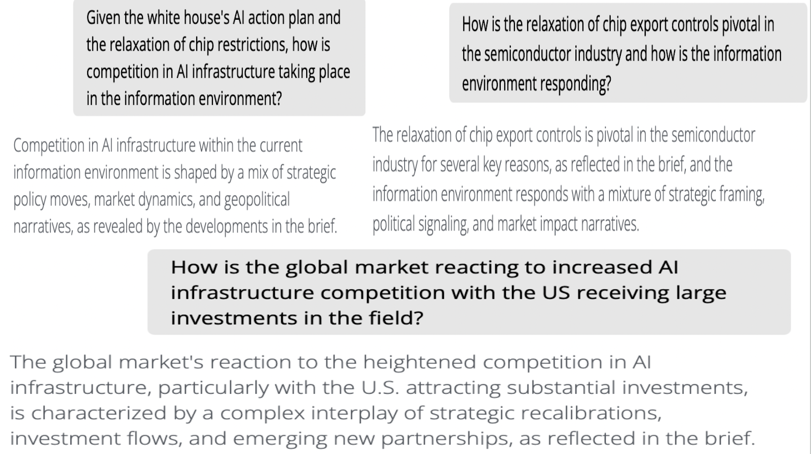 Global Cognitive Adversaries (GCA) narratives frame the White House AI Action Plan as a pivot toward deregulated technological dominance. Across 14 unique sources amplifying 21 narrative items, messaging focuses on US efforts to prioritize infrastructure expansion, reduce regulatory friction, and assert leadership in the global AI economy. These narratives identify the Trump administration’s policy as protectionist, economically motivated, and structured to stifle Chinese technological growth. Amplifiers describe an alignment between US industrial interests and federal initiatives, emphasizing datacenter construction, AI export acceleration, and politically neutral AI development.