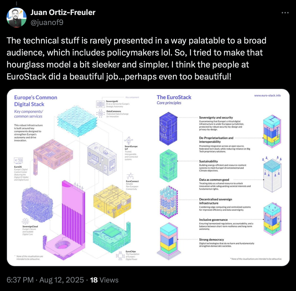 On August 12, 2025, @juanof9 commentary amplified the EuroStack narrative as more than just a technical project—it’s a strategic play for European digital sovereignty. By deploying simplified internet stack diagrams for policymakers, the initiative reframes complex infrastructure into an accessible visual language, creating clarity where opacity once dominated. This isn’t just education; it’s narrative engineering—positioning EuroStack as the scaffolding for a future where Europe breaks free from systemic reliance on U.S. and Chinese tech ecosystems. Backed by a projected €300 billion, decade-long investment, EuroStack signals Europe’s intent to rewrite the rules of global connectivity and assert itself as a third digital pole in a bipolar tech order.