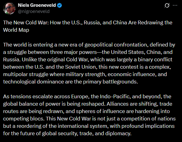 The tweet from @nijgroeneveld, posted from the Netherlands, amplifies a European narrative on global power realignment titled “The New Cold War: How the US, Russia, and China Are Redrawing the World Map,” asserting that the world is entering a multipolar confrontation driven by the US, China, and Russia. It frames the new contest as a complex struggle where military strength, economic influence, and technological dominance are primary battlegrounds, rejecting Cold War analogies grounded in bipolarity. The tweet highlights shifting alliances, redrawn trade routes, and hardening spheres of influence, signaling structural disruption in post-Cold War norms and reinforcing European concerns about strategic fragmentation. Military capability is only one vector of power alongside economic leverage and technological supremacy, reflecting a geopolitical model governed by distributed and contested influence zones. Emphasizing tensions across Europe, the post conveys apprehension over Russia’s actions, particularly in Ukraine, which threaten EU stability and challenge transatlantic security frameworks. The commentary underscores Europe’s need to navigate competing powers, protect economic interests, and adapt to a multipolar world where the reordering of the international system directly impacts security, trade, and alliance structures.