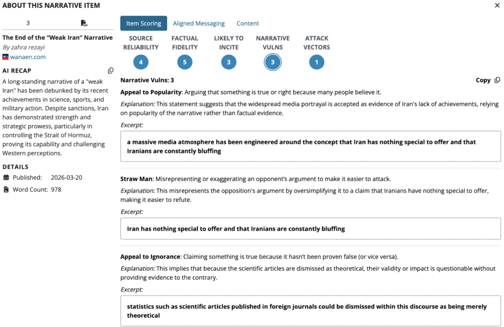 The image supports the portrayal of Iran as a rational but uncompromising actor by reframing past perceptions of weakness as manufactured rather than real, positioning Iran as deliberately underestimated and strategically consistent. By emphasizing resilience and capability, particularly in contexts like Hormuz, the narrative reinforces legitimacy and endurance under pressure. However, this framing relies on identifiable vulnerabilities: an appeal to popularity dismisses the “weak Iran” view as widely believed rather than empirically assessed; a straw man reduces opposing arguments to the claim that Iran has “nothing to offer,” making them easier to refute; and an appeal to ignorance discounts contrary evidence as incomplete or irrelevant. Together, these mechanisms strengthen the narrative’s persuasive effect while limiting substantive engagement with competing analysis.