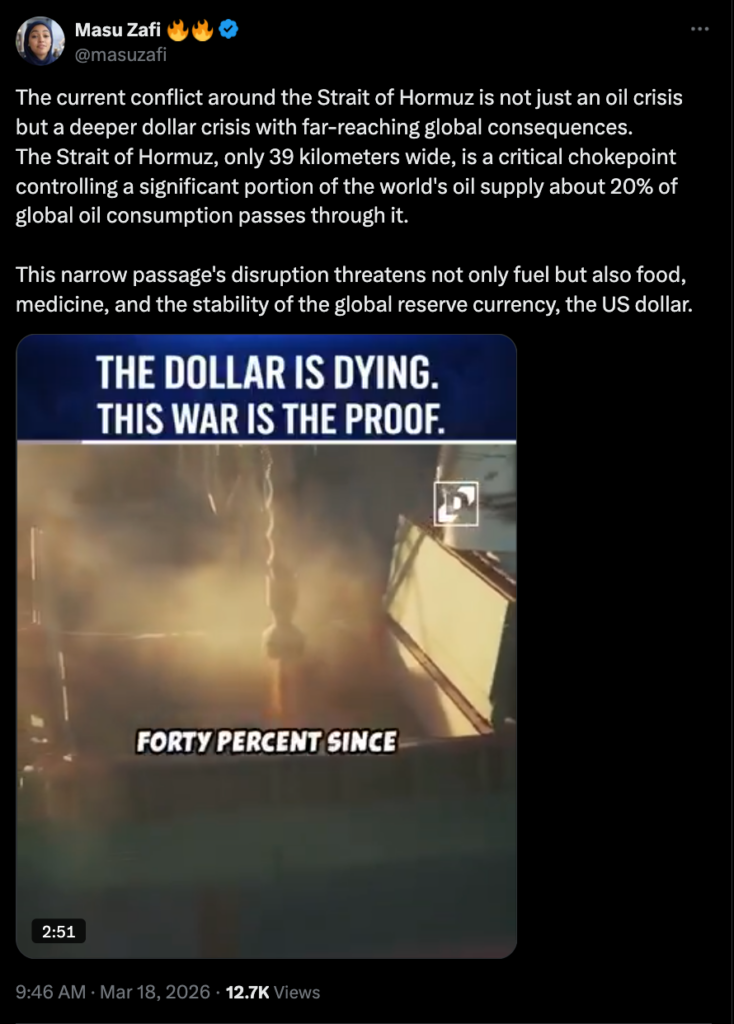 The attached video and headline—“THE DOLLAR IS DYING. THIS WAR IS THE PROOF.”—reinforce a common geopolitical narrative that U.S. financial dominance is collapsing due to global conflict and shifting energy trade dynamics. This framing echoes broader “de-dollarization” narratives frequently circulated in online geopolitical discourse, where disruptions to oil flows or conflicts in strategic chokepoints are interpreted as catalysts for the end of the dollar-based global financial system. The post therefore functions less as analysis of the maritime situation and more as narrative amplification: it uses the Hormuz chokepoint as symbolic evidence for a predetermined conclusion about U.S. economic decline, leveraging crisis imagery and statistics about oil transit to lend credibility to that broader claim.