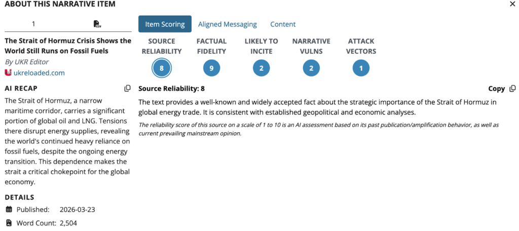The narrative map above illustrates a coordinated information operation with clear directional intent — arcs originating predominantly from Eastern Europe, particularly Sofia, radiate outward toward Western capitals, Middle Eastern hubs, and East Asian nodes, before converging heavily on Tehran as the primary destination. This pattern suggests a deliberate amplification network designed to shape how the Strait of Hormuz crisis is perceived across allied and partner nations. The narrative architecture appears structured to establish initial credibility before redirecting influence. Early-stage dissemination mimics Western-origin discourse to build trust, followed by a concentrated shift in messaging volume toward Tehran, where the narrative’s strategic impact is ultimately consolidated. Amplified content surrounding the Strait of Hormuz crisis focuses on portraying the conflict as a sustained threat to global energy stability, emphasizing volatility in oil and gas markets to heighten fears of shortages and economic disruption. At the same time, synthetic and coordinated messaging amplifies concerns about inflation and insecurity, framing the crisis in ways that can deepen distrust, polarize audiences, and increase susceptibility to influence during politically sensitive periods.