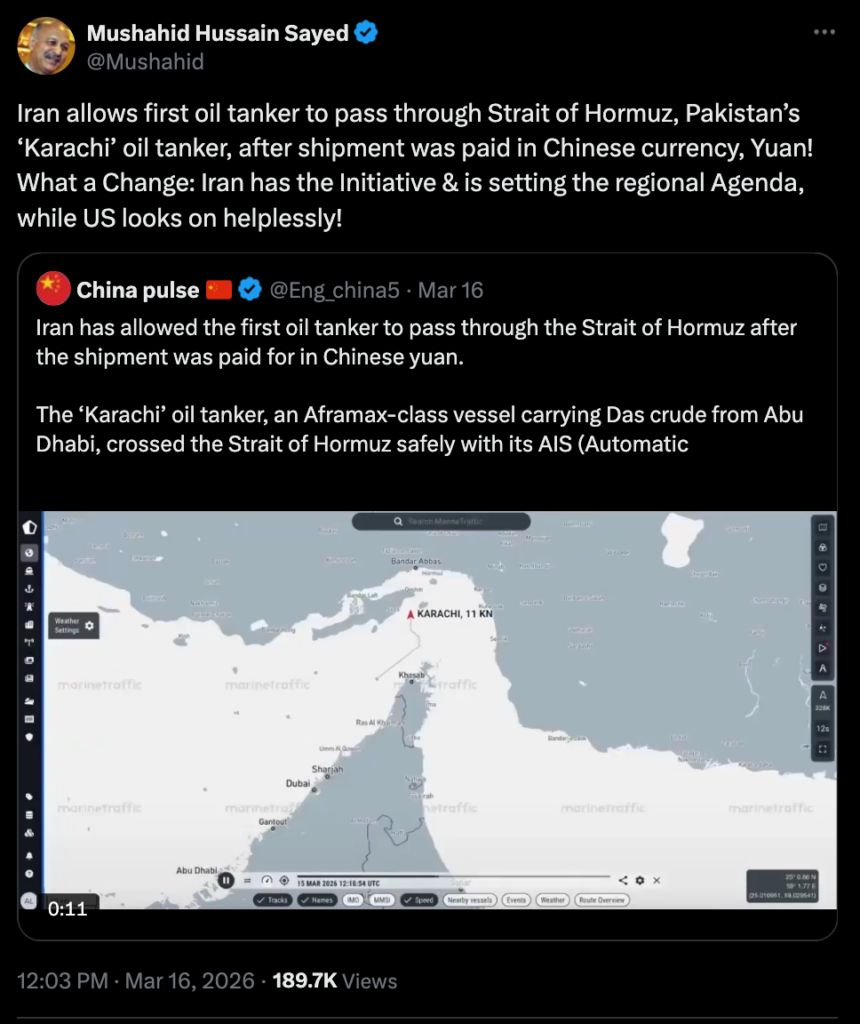 This post signals developments in the Strait of Hormuz through a geopolitical narrative emphasizing the decline of U.S. influence and the rise of alternative economic alignments. By highlighting that the tanker transit was allegedly permitted after payment in Chinese yuan, the post suggests a shift away from the dollar-denominated oil trade system that has historically underpinned U.S. financial influence. The accompanying commentary amplifies this interpretation by portraying Iran as “setting the regional agenda” while the United States “looks on helplessly,” reinforcing a broader narrative of declining Western leverage in Middle Eastern energy security. The emphasis on yuan-denominated payment also implicitly elevates China as a growing economic power capable of reshaping regional trade dynamics, aligning the event with wider online narratives about de-dollarization and the emergence of alternative financial systems tied to Chinese influence. By presenting a single tanker transit as evidence of a structural shift in global energy trade, the post transforms a discrete event into symbolic proof of a broader geopolitical realignment.