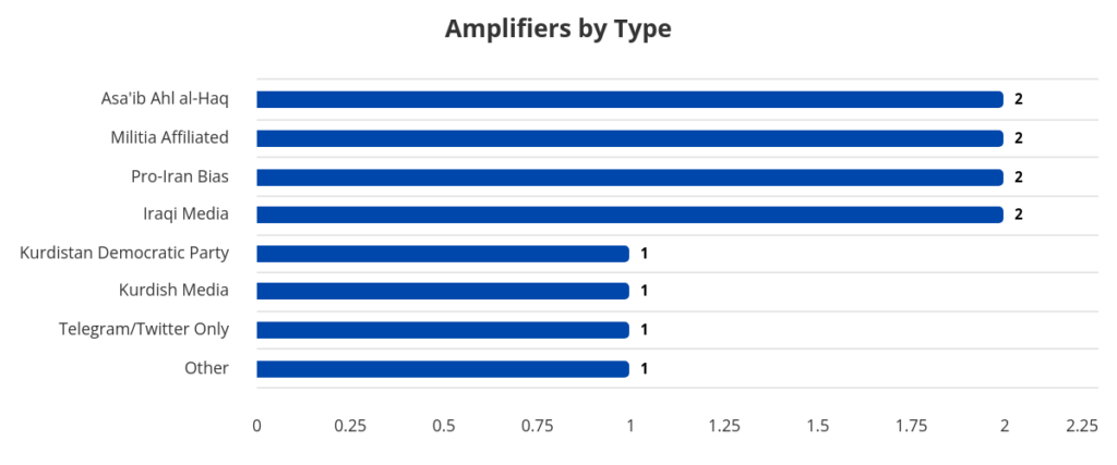Outlets monitored by EdgeTheory that amplified narratives about the CF between 22-31 December. Militia affiliated sources and pro-Iran sources amplified CF narratives the most. Several Iran-backed militias’ political wings (including Asa’ib Ahl Al-Haq’s) are part of the CF, so militia-affiliated and pro-Iranian outlets promote the CF’s electoral achievements. Asa’ib may have been a particularly strong amplifier because the group’s political wing made notable electoral gains.