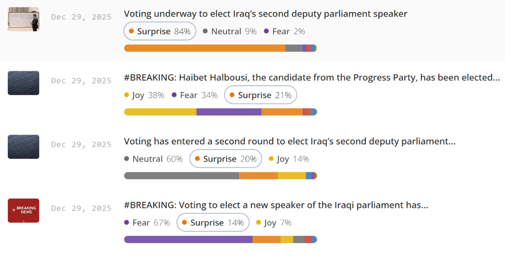 Haibat Al-Halbousi was one of the most widely covered entities within the Iraqi media narrative items EdgeTheory gathered in the last month (top), likely because electing a parliament speaker is the first major constitutionally required step towards forming a government. Among the Iraq sources EdgeTheory monitors, all of the top articles using language indicating surprise on 29 December (the date of the first parliament session) pertained to the speaker or deputy speakers’ election (bottom). This could indicate that the victors surprised domestic observers. In contrast, the bottom item, which announced that vote counting for the speakership was underway, may have scored high on “fear” because intra-Sunni political negotiations to determine the next speaker had been deadlocked for over a month. Meanwhile, the second item (announcing the winner) scored high on “joy,” possibly indicating relief at resolution of the deadlock.