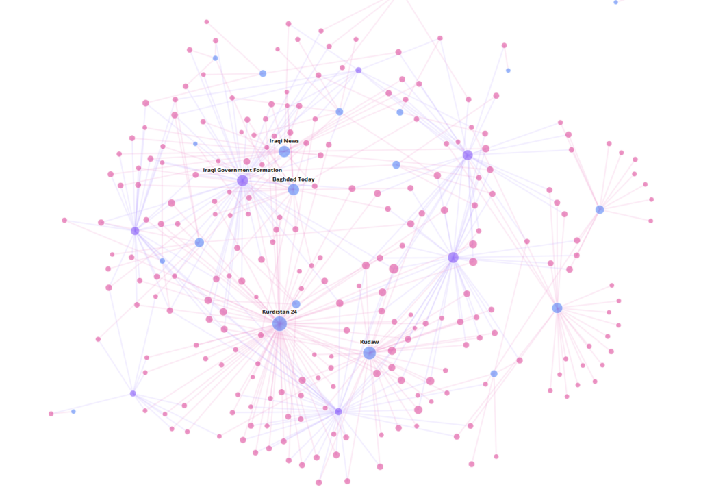 Iraq sources monitored by EdgeTheory covered several themes relating to Iraq’s government formation in the last 30 days. Kurdistan24, Rudaw, Iraqi News, Baghdad Today, and the Patriotic Union of Kurdistan (PUK) media published the highest number of narrative items pertaining to government formation overall. Three out of these five outlets are politicized and linked to Kurdish parties. Kurdistan24 and Rudaw provide pro-Kurdistan Democratic Party coverage. PUK media is the PUK’s official media arm. Iraqi News describes itself as independent, but information on the site’s ownership is not publicly available. Baghdad Today is independent.