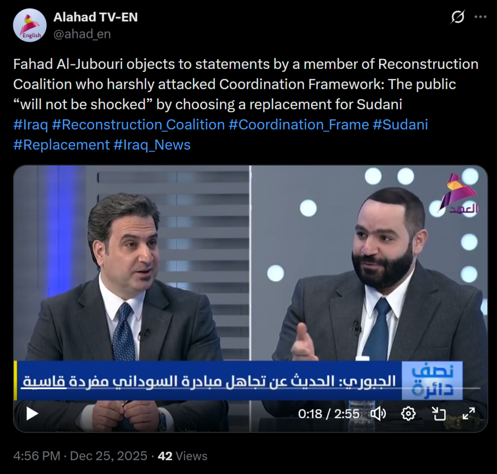 X post surfaced by EdgeTheory showing Wisdom Trend member Fahad Al-Jubouri (left) claiming the public “will not be shocked” if Al-Sudani is replaced. Al-Jubouri was speaking on Asa’ib Ahl Al-Haq-owned Al-Ahad TV’s “Semi Circle” segment.