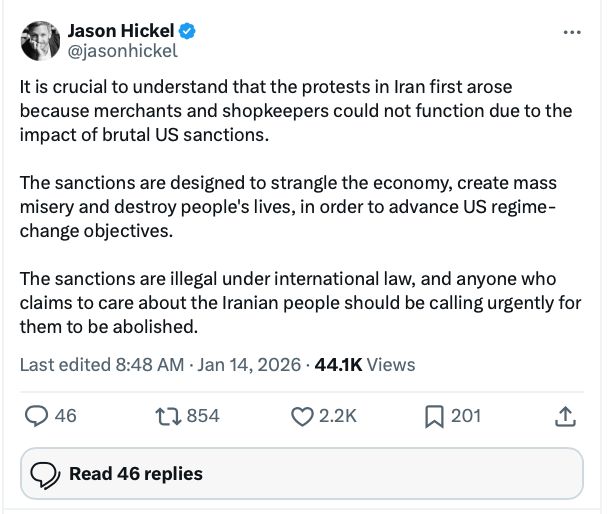 Jason Hickel’s January 14, 2026 X post, which quickly drew tens of thousands of views and widespread engagement, functions as a key narrative pivot in online discussion of the Iran protests by framing the unrest primarily as the result of crippling U.S. sanctions rather than internal political or social grievances. As an established critic of global inequality, Hickel argues that sanctions have “strangled the economy” and inflicted widespread hardship, pushing everyday Iranians into crisis and fueling protest activity. By emphasizing external economic pressure over domestic policy failures, his message redirects blame toward foreign actors and aligns with broader narratives that cast the protests as influenced or exploited by U.S. interests. This framing resonates with audiences skeptical of Western intervention, contributes to polarized debate online, and highlights how influential individuals can shape narrative direction by blending factual economic effects with strategic political interpretation.