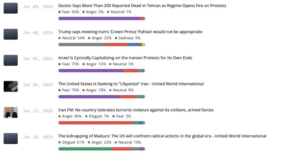 Analysis of headlines about the 2026 Iranian protests shows that fear is the dominant emotional framing, followed by anger and then neutrality. Headlines that scored highest for fear tended to portray the protests as a threat to Iran’s stability and sovereignty rather than simply domestic unrest. The most fear-driven narratives included reports of over 200 deaths in Tehran from regime crackdowns (94% fear), claims that Israel was exploiting the protests (75% fear), and assertions that the United States sought to “Libyanize” Iran (70% fear). These frames suggest a consistent narrative that the protests could lead to foreign-backed regime change, drawing parallels to past interventions like Libya.