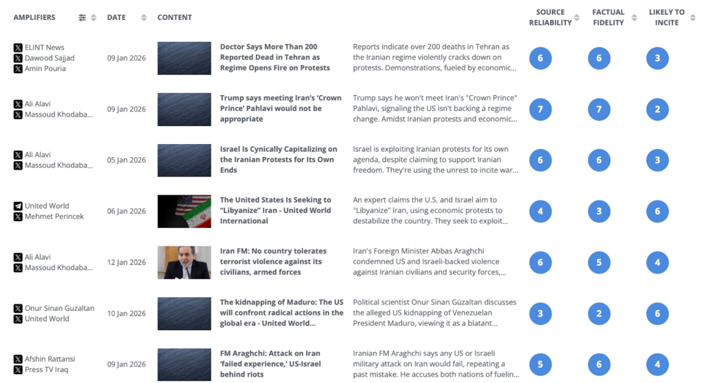 Drawing on geospatial analysis, narrative attribution, and network detection across websites, social media, RSS feeds, and X, the report maps how narratives around economic collapse, state violence, foreign interference, and regime change propagate and reinforce one another. The analysis traces how state media, diaspora influencers, foreign-aligned information actors, and automated networks interact—using emotional framing and coordinated amplification to shape public understanding and policy risk.