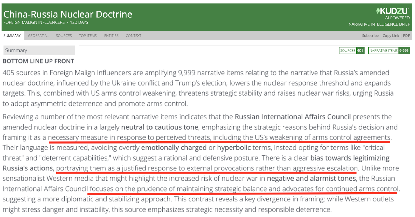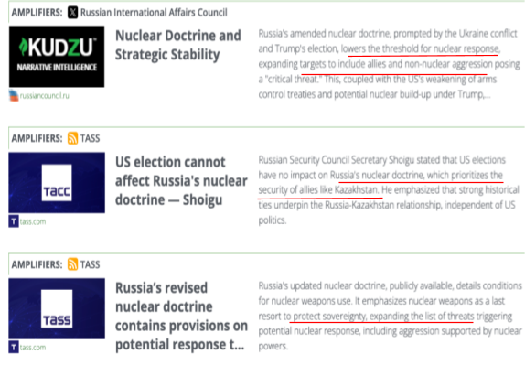 Other Foreign Malign Influencers (FMI) reinforce this narrative strategy by portraying Russia’s decision to lower its nuclear threshold as a legitimate policy choice. They frame the concentration of final decision-making authority in President Putin as a safeguard against potential coups or efforts by military factions seeking escalation. However, this centralization of power ultimately increases—rather than reduces—strategic risk, highlighting a key framing technique employed by these FMI. These narratives are amplified through articles and social media posts that are word for word the same then published by multiple by state run sources such as TASS or Sputnik.