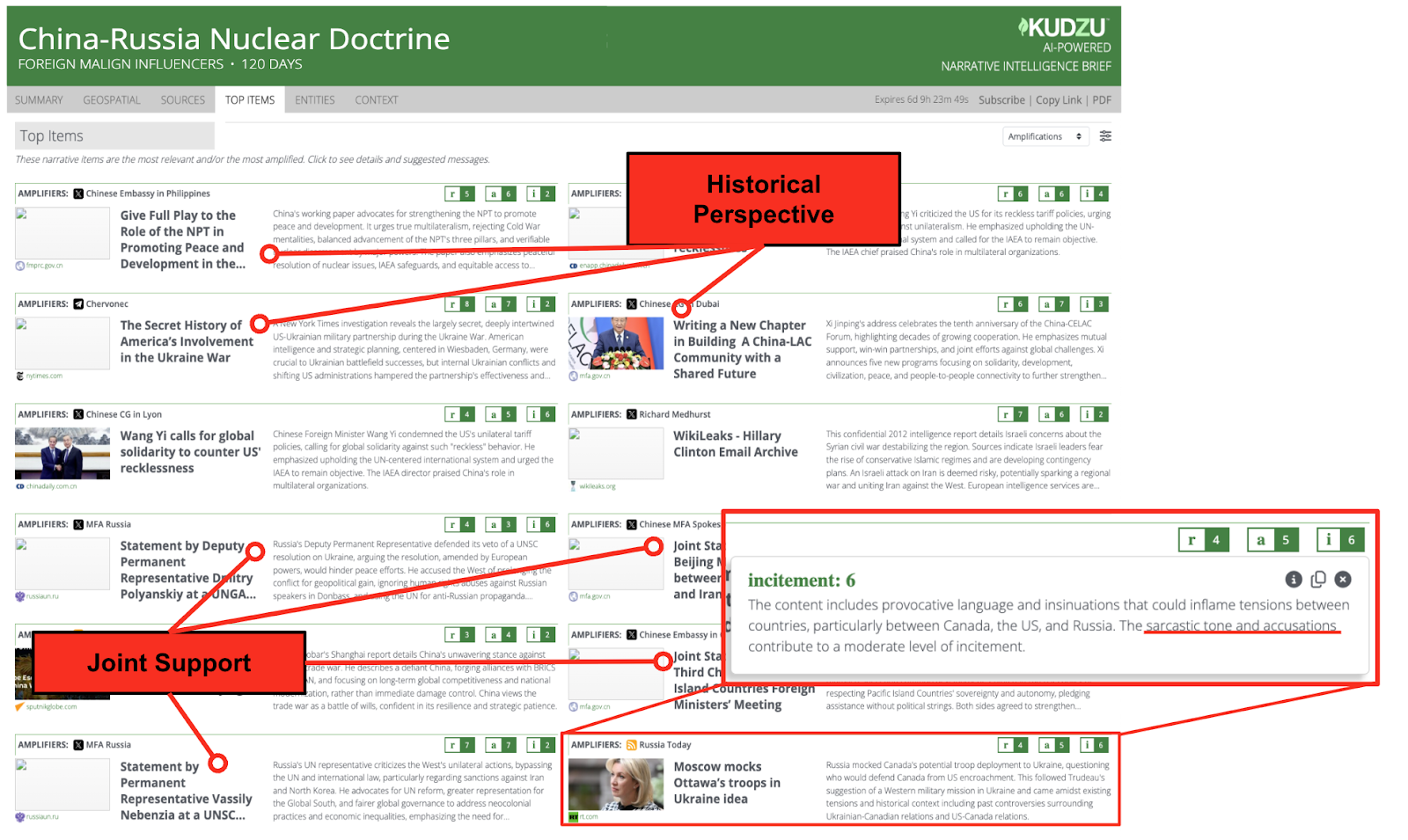 It is important to note that both China and Russia-aligned sources leverage historical perspectives to assert contemporary accusations that promote national interests. Across most amplified items, sources consistently promote narratives that frame Russia and China as deeply cooperative and historically successful nuclear powers, occasionally also utilizing sarcasm, as identified by EdgeTheory incitement measurements.