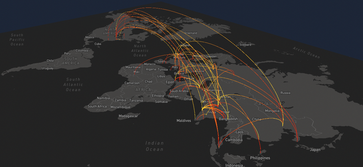 Screenshot of geospatial narrative origins (red) and targets (yellow) from EdgeTheory brief on “China-Russia Nuclear Doctrine”