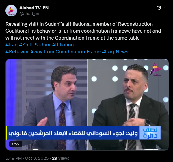 Asa’ib Ahl Al-Haq-affiliated Al-Ahad TV coverage claiming Al-Sudani’s affiliations have “shifted” away from the Coordinating Framework. Asa’ib Ahl Al-Haq is a militia with political representation in the Coordinating Framework.