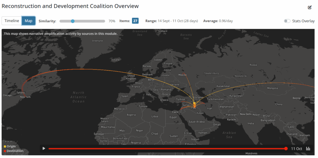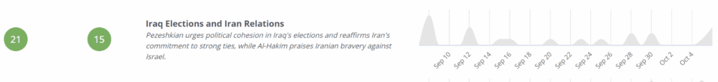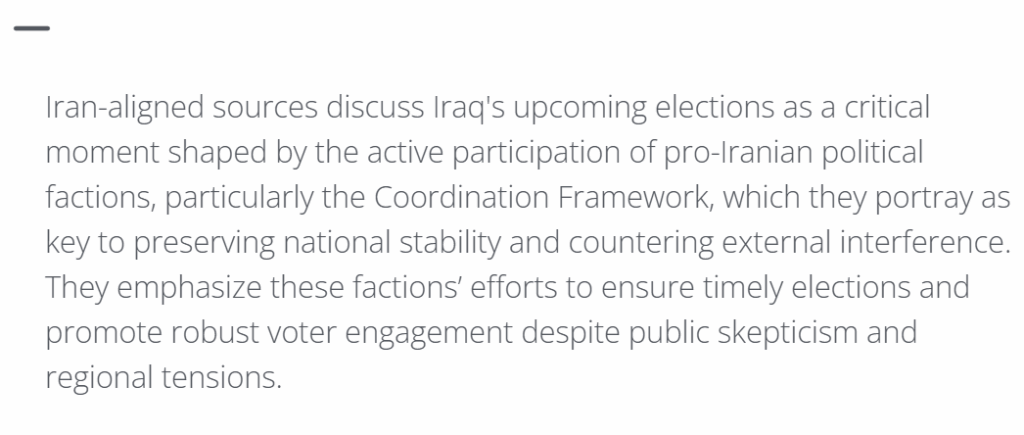 In previous elections and government formation processes, Iran has generally called for unity among Iraq’s Shi’a parties. Notably, on 7 September, National Wisdom Movement leader Ammar Al-Hakim met with Iranian President Masoud Pezeshkian in Tehran [21]. The National Wisdom Movement is part of the Coordinating Framework. During the meeting, Pezeshkian reportedly emphasized Islamic unity and Iran-Iraq relations, warning against “divisive agendas” sown by adversaries. Consistent with this theme, Pezeshkian also called for political cohesion “beyond ethnic and sectarian lines” in Iraq’s upcoming election [22]. These narratives were reflected in Edge Theory’s monitoring of Global Cognitive Adversaries’ coverage of Iraq’s elections: