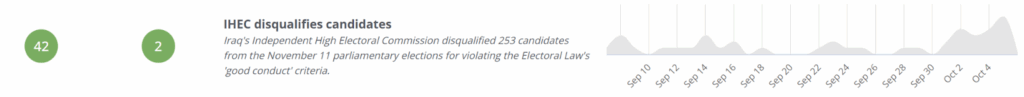 If recent trends continue, Iran-backed parties are unlikely to win a significant number of parliamentary seats on their own. However, we can expect them to maximize their leverage through all means at their disposal - lawsuits and allegations of electoral fraud, and partnering with powerful parliamentary allies including Al-Maliki - to ensure their interests, and Iran’s, are represented when the government is formed. It is worth noting that this year, Iraq’s Independent High Electoral Commission disqualified a record number of candidates [15]. Notably, this record number of disqualifications comes after Al-Maliki called on the Accountability and Justice Commission (a commission tasked with removing traces of Ba’ath Party ideology from Iraq) and Iraq’s Independent High Electoral Commission to investigate candidates’ backgrounds to prevent Ba’ath Party supporters from running [16]. Al-Maliki-appears to have used such measures to target his political opponents, including individuals allied with Al-Sudani and even some opponents within the Coordinating Framework [17]. Edge Theory’s monitoring shows these disqualifications have remained a consistent theme in Iraqi media: