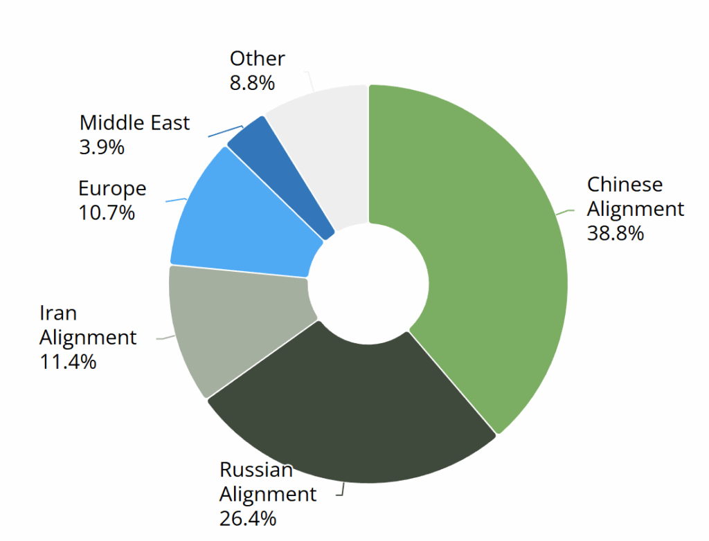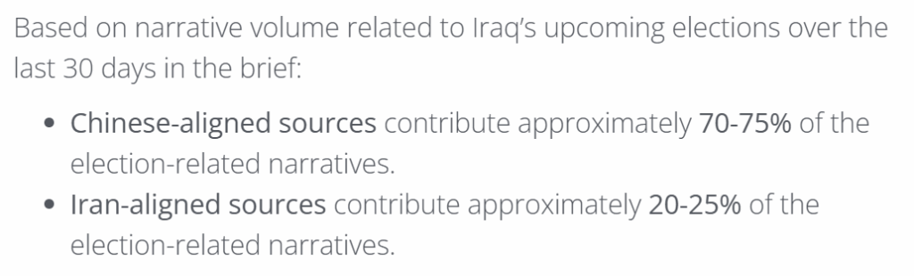 A number of sources supportive of Global Cognitive Adversaries and monitored by Edge Theory engaged in prominent narrative activity over the last 30 days. Of this activity, most coverage of the Iraqi elections came from Shafaq News, which Edge Theory has assessed as aligning with China as it publishes or amplifies content that aligns with themes or perspectives favorable to US adversaries, including China. Meanwhile, Iran-aligned sources (including Iranian state-owned outlets) comprised approximately 20-25% of the Iraqi election coverage within the module. Russian outlets monitored did not directly discuss the Iraqi elections within the 30-day period:
