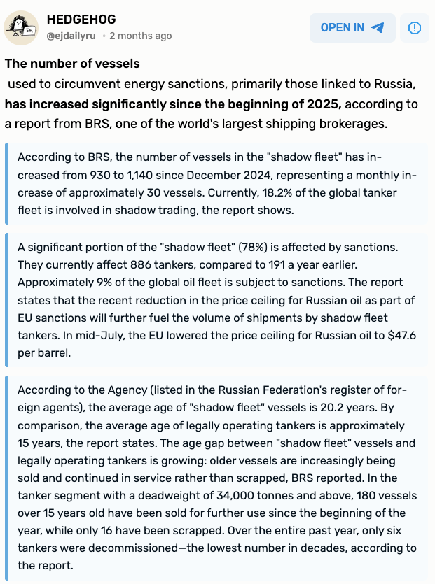 Russia’s shadow tanker fleet has become a fixed feature of the global oil market, not a temporary workaround. It has grown from 930 ships in late 2024 to 1,140 by mid-2025—roughly 18% of the world’s tanker capacity. Almost 80% of these vessels now face sanctions, a fourfold increase in a year. The EU’s price cap cut to $47.6 per barrel has pushed traders deeper into opaque networks that use reflagged and shell-owned ships to keep exports moving. The average shadow vessel is 20 years old, five years older than compliant ships. Owners are holding on to aging hulls instead of scrapping them: 180 have been repurposed this year, only 16 dismantled, and just six scrapped globally—the lowest count in a decade. The data show a durable system of evasion taking shape. Sanctions have not constrained trade; they have restructured it into a parallel, unregulated maritime economy built on concealment and profit.