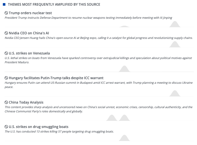 This table is from EdgeTheory’s Chinese Rare Earth Materials Brief and exemplifies amplification narratives across the GCA Social Media Module. The GCA Social Media module’s visual analytics don’t show noise—they show pattern density: Moon of Alabama, United World International (UWI) and its variant, Expert Ideas, and The International Affairs Journal each provide 4% of all items in the brief.