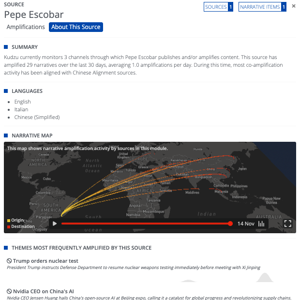 These sources circulate similar narratives such as: Western “resource insecurity,” “multipolar sovereignty,” and China as a rational actor. In the dataset, amplification is less about virality and more about narrative pressure—small amplification narratives produce sustained resonance across overlapping discourse clusters. The narrative sources and targets point to engineered coordination that turns individual Chinese and Russian posters into the scaffolding of strategic influence.