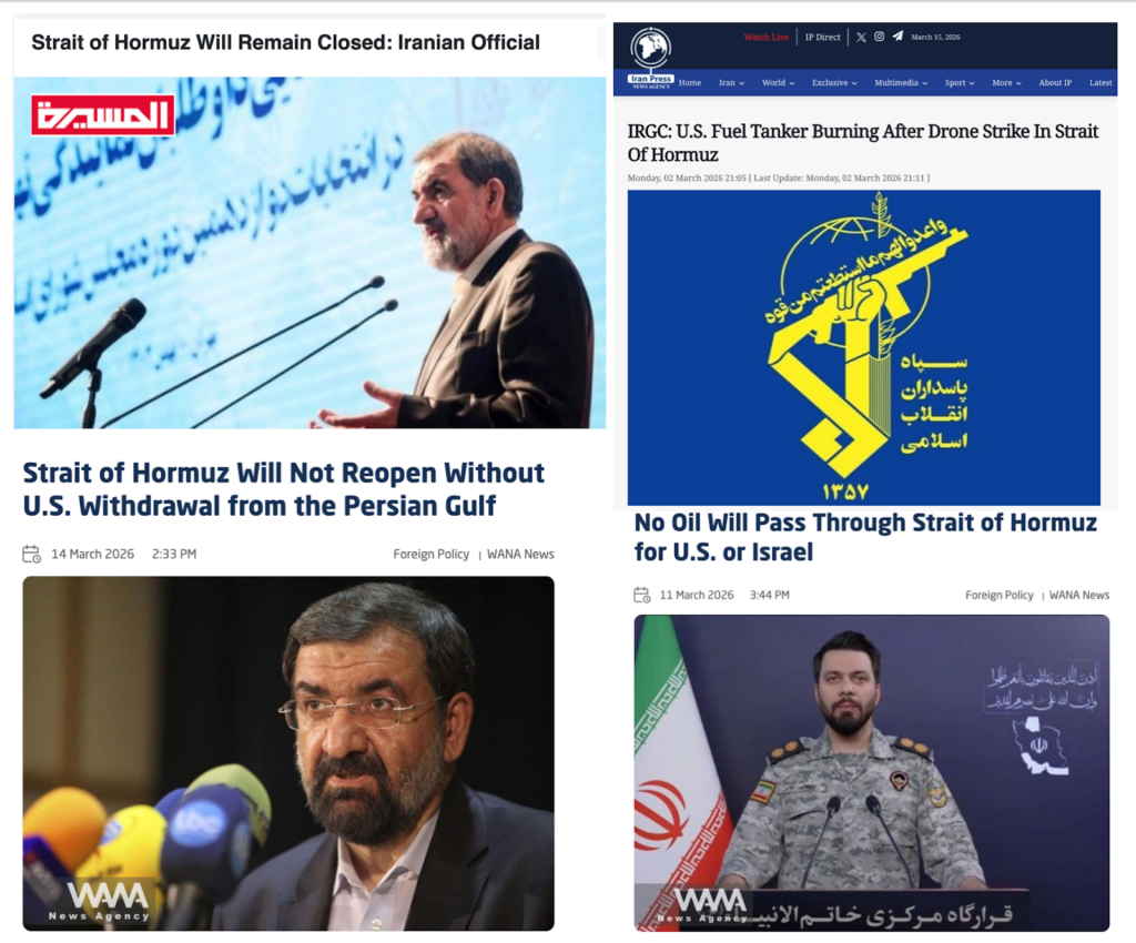 This is largely the propagation pathway that Iranian narratives around the Strait of Hormuz have followed. The Strait was officially closed on March 2nd, with the first media announcements from Tehran appearing on March 4th. However, warnings about a potential closing appeared much earlier. On February 18th, for instance, the Yemen Press Agency amplified a statement by Rear Admiral Alireza Tangsiri to the effect that the Islamic Revolutionary Guard Corps (IRGC) was "ready to close the strategic Strait of Hormuz upon an order by Iran’s top echelons." The purpose of this early narrative was likely to discourage a U.S.-Israeli assault on Iran, an aim at which it did not succeed.