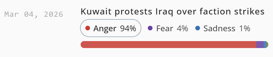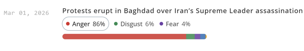 Among the Iraq-related narratives gathered by EdgeTheory, narratives covering the Iran-backed Iraqi factions’ escalation on Iran’s behalf following Khamenei’s death relied heavily on language evoking anger. This could reflect both anger at Khamenei’s death itself and regional anger in response to Iraqi factions’ escalation against Gulf countries.