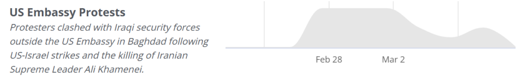 Narrative volume pertaining to Khamenei’s death, and Iraqi protestors’ subsequent reactions, increased on 28 February (the date of his death) and remained escalated through 1 and 2 March. Iraqi protesters attempted to breach the Green Zone near the US Embassy first on the evening of 28 March, then gathered for 2 additional nights.