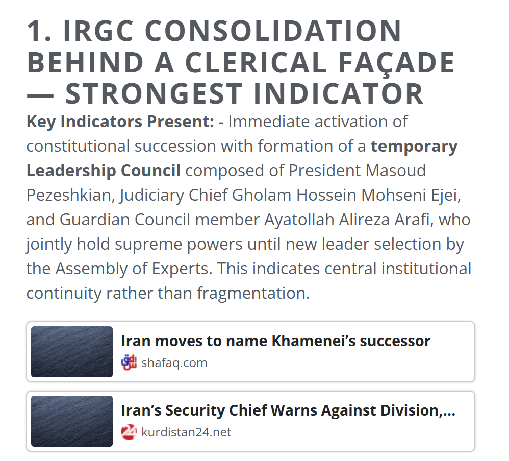 | (Left) EdgeTheory has identified that, among the sources it monitors, most indicators suggest enough Iranian regime personnel survive to adhere to the Iranian constitution’s requirements to appoint Khamenei’s successor. Iran’s president, judiciary chief, and one Guardian Council member hold executive power until the 88-member Assembly of Experts selects a new Supreme Leader. (Right) As the regime seeks to appoint a successor while withstanding US and Israeli strikes, a protracted regional conflict is likely. |