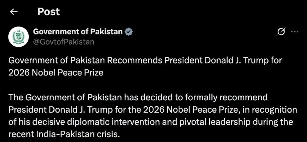 Pakistan nominates Trump for the Nobel Peace Prize on June 20 on X, shortly after stating its support of Iran on June 14