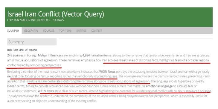 EdgeTheory narrative analysis leveraged vector queries to surface semantically aligned content. Unlike keyword searches, vector queries detect thematic intent, making them effective for tracking coordinated influence leveraging similar but not identical wording. EdgeTheory analysis reveals WION News maintains a neutral, fact-based tone, contrasting sharply with Iranian state-aligned sources that use provocative language to reinforce encirclement narratives .