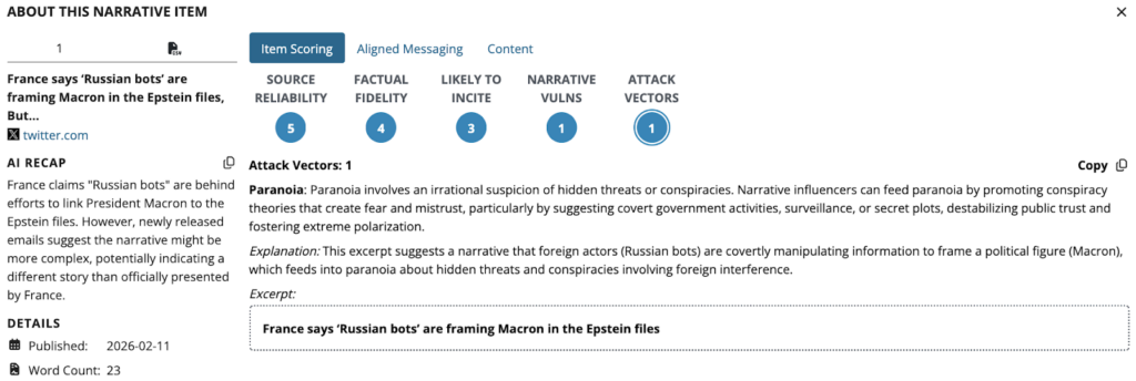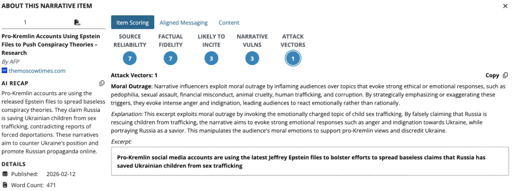 Recent campaigns illustrate how malign actors exploit emotional narratives to maximize reach and engagement. Allegations tied to widely known scandals—such as the crimes of Jeffrey Epstein—are frequently repurposed to discredit Western political leaders, undermine public trust in democratic governments, and weaken support for Western foreign policy objectives. These narratives are rarely intended to prove a single claim; instead, they introduce competing accusations and conspiratorial explanations that flood the information environment and generate uncertainty.