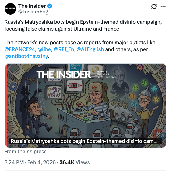 Russian information operations increasingly rely on AI and leverage large networks of inauthentic social media accounts, synthetic media, and coordinated cross-platform amplification. High-profile scandals - such as the crimes of Jeffrey Epstein—are frequently repurposed to discredit Western political leaders.