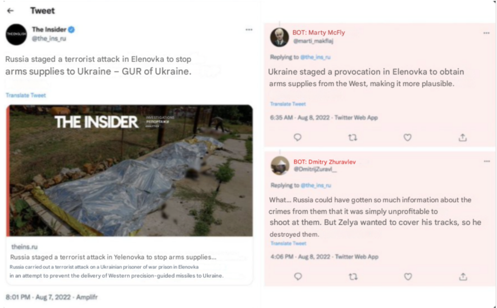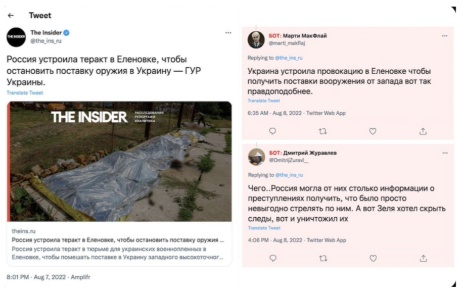 The post illustrates a common narrative tactic used in coordinated disinformation campaigns: the rapid introduction of counter-claims that shift blame and create confusion around a reported event. After a report by The Insider alleging Russian responsibility for the Olenivka attack, bot accounts responded with alternative explanations, accusing Ukraine of staging the incident to secure Western weapons. By presenting these replies as ordinary user reactions on X, the campaign attempts to manufacture the appearance of debate and uncertainty. This strategy does not aim to prove a specific alternative narrative but instead seeks to undermine the credibility of the original report and dilute accountability by flooding the conversation with competing claims.