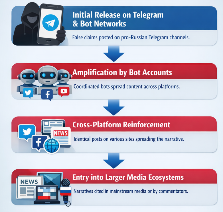 Russian influence networks often follow a structured pipeline to move false narratives from fringe platforms into mainstream discussion.