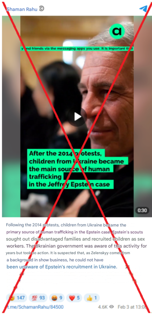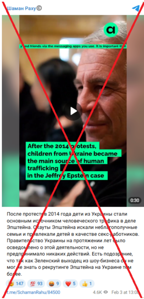The narrative itself relies on a common disinformation strategy—linking a real and emotionally charged criminal case to a major political event without providing verifiable evidence. The video claims that Ukrainian elites supposedly knew about child trafficking connected to Epstein after 2014 and “turned a blind eye,” and the accompanying text further insinuates that Ukrainian authorities, including Volodymyr Zelensky, may have been aware of the alleged activity. By invoking the exploitation of children and combining it with accusations against political leaders, the post seeks to provoke outrage and encourage rapid sharing. Such narratives fit a broader pattern of disinformation that attempts to discredit Ukraine and its leadership by associating them with one of the most notorious criminal cases in recent history.