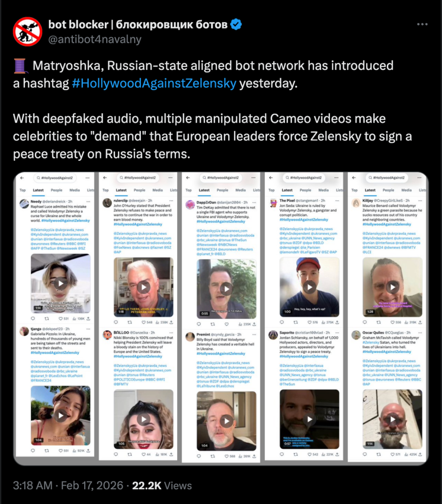 The post suggests a coordinated influence operation designed to manufacture the perception of widespread cultural and political opposition to Ukraine’s leadership. By promoting a unified hashtag and circulating multiple clips that appear to show celebrities delivering similar political messages, the campaign attempts to simulate organic consensus and social momentum. A central tactic in this effort is the use of manipulated Cameo videos combined with deepfaked audio, which alters or overlays celebrity speech to make it seem as though public figures are calling on European leaders to pressure Volodymyr Zelensky to sign a peace deal on Russia’s terms. This approach exploits the familiarity and perceived authenticity of personalized video platforms like Cameo, where short messages from celebrities are common, making manipulated clips more believable to viewers.