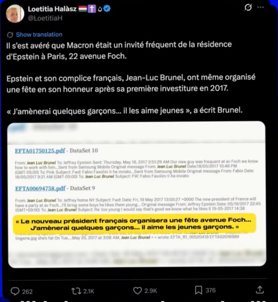 This post frames a claim that Emmanuel Macron was a “frequent guest” at a Paris residence allegedly tied to Jeffrey Epstein, and that Epstein and Jean-Luc Brunel organized a celebration for him in 2017. The structure is typical of deceptive narratives: it presents highly specific details (a street address, a quoted message, a date tied to Macron’s first inauguration) to create an appearance of evidentiary depth, while relying on unverifiable or previously debunked sources. The inclusion of a blurred document image and a dramatic quote (“I’ll bring some boys… he likes them young”) is designed to provoke moral outrage and bypass critical scrutiny.